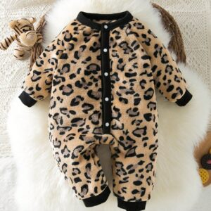 جمبسوت طباعة الفهد شريط متباين أزرار أمامية للبنات الاطفال – Size: 18-24M
