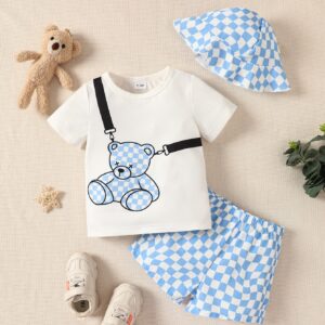 للاطفال طباعة بالدب تي شيرت و بطباعة مربعات بنطلون قصير و قبعة – Size: 6-9M
