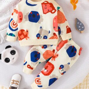 للاولاد الاطفال خريف ياقة دائرية قميص ثقيل و بناطيل رياضي طقم , بطباعة حيوان ورسوم كارتون 2 قطع – Size: 9-12M
