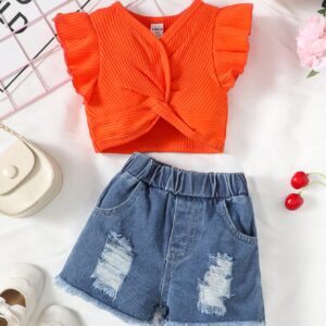 للاطفال مطوي امامي مقلم بكشكش تي شيرت و ممزق حافة خام طقم شورت – Size: 2-3Y