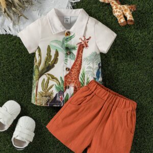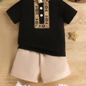 ملابس عارضة للأطفال الصبي القميص الأزرق القصير ذات الأكمام القصيرة والسراويل الكاكي العارية الذراعين والتي تحتوي على طيات صيفية، الربيع/الصيف – Size: 6-9M