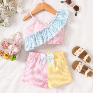 ملابس طفلة أعلى عنق غير متماثل مع حواف خطوط متقاطعة وشورت لامعة أمامياً وقوس أمامياً – Size: 9-12M