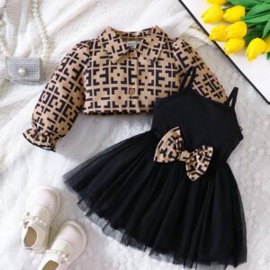 للبنات الاطفال طباعة هندسية اكمام واسعة جاكيت & عقدة الفراشة أمامية شبكي شامل فستان كامي – Size: 2-3Y