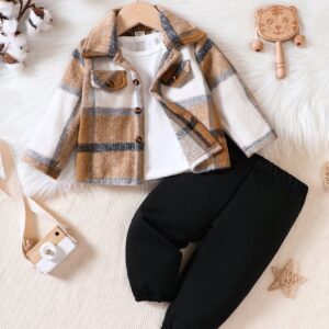 معطف طباعة مربع النقش بتفاصيل رفرف مع بنطلون بدون تي شيرت للاولاد الاطفال – Size: 6-9M