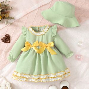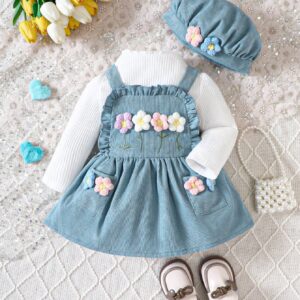 للبنات الاطفال وقوف الياقة تي شيرت & بطباعة أزهار كروشيه زخرفة مقلم بهدب فستان افرول & قبعة – Size: 12-18M