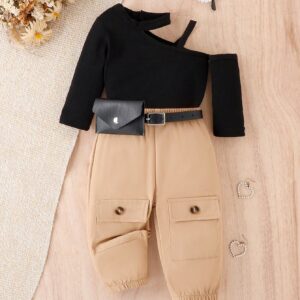 للبنات الاطفال ياقة غير متماثل تي شيرت & جيب قلاب بنطلون & حقيبة حزام – Size: 12-18M