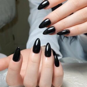 ارتقي بأسلوبك مع مجموعة أظافر وهمية سوداء طويلة على شكل لوز مكونة من 24 قطعة، تصميم مناسب تمامًا ومتوسط الطول، للنساء والفتيات لملابس العمل اليومية – Size: