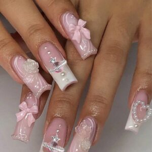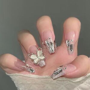 براقة مع 24 قطعة طويل مربع ثلاثي الأبعاد أبيض , وردي كوكب حجر , و ربطة عقدة الفراشة , لؤلؤ Love يضعط الأظافر & الأظافر الزائفة للنساء و بنات – Size: