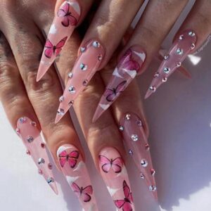 رفع لك أسلوب مع 24 قطعة طويل لوز جرافيك الفراشة حجر الراين أظافر اصطناعية ملف الأظافر 1قطعة & ورقة واحدة شريط – Size: