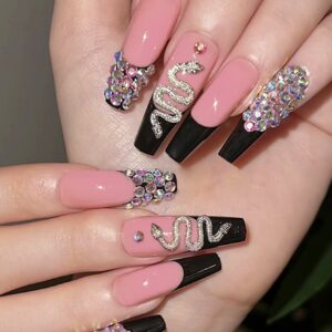 في الحال يرقي مظهرك مع 24 قطعة طويل نعش أسود فرنسي حجر الراين ثلاثي الأبعاد بديكور ثعبان أظافر اصطناعية ملف الأظافر 1قطعة & ورقة واحدة شريط – Size: