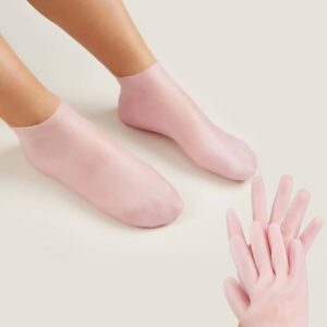 مجموعة جوارب وقفازات ترطيب السبا المريحة، جوارب سيليكونية ناعمة باء الكعب جيل مع قفازات العناية بالجلد، يساعد في تجفيف القدمين، والكعب المتشقق، والتشققات، والبشرة الخشنة، والجلد الميت، استخدميها مع لوشناتك المفضلة للاستمتاع بجلسة تدليك في السبا، اللون وردي – Size: one-size
