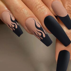 يرقي مظهرك مع 24 قطعة طويل نعش أسود موحدة اللون بطباعة نار مادة أظافر اصطناعية ملف الأظافر 1قطعة & ورقة واحدة شريط – Size: