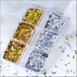 6 شبكات ثلاثية الأبعاد الذهب والفضة أربع نجوم مدببة مسمار بريق الترتر زينة نجمة القمر بريق لملحقات تصميم مانيكير – Size: