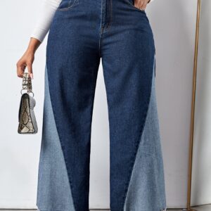بنطلون جينز خصر عالي ألوان متباينة مقلم بخام ساق عريضة مقاس كبير – Size: 3XL