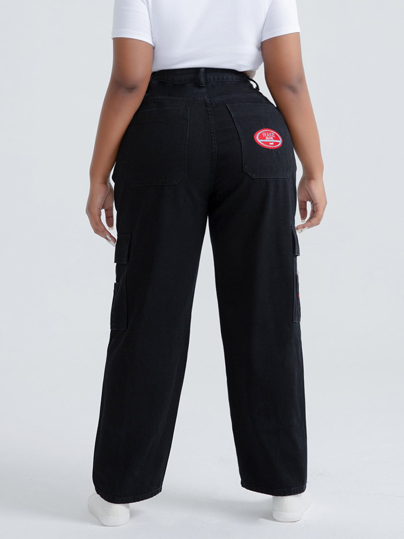 بنطلون جينز بجيب رفرف بتفاصيل مرقع بخصر عالي مقاس كبير – Size: 4XL