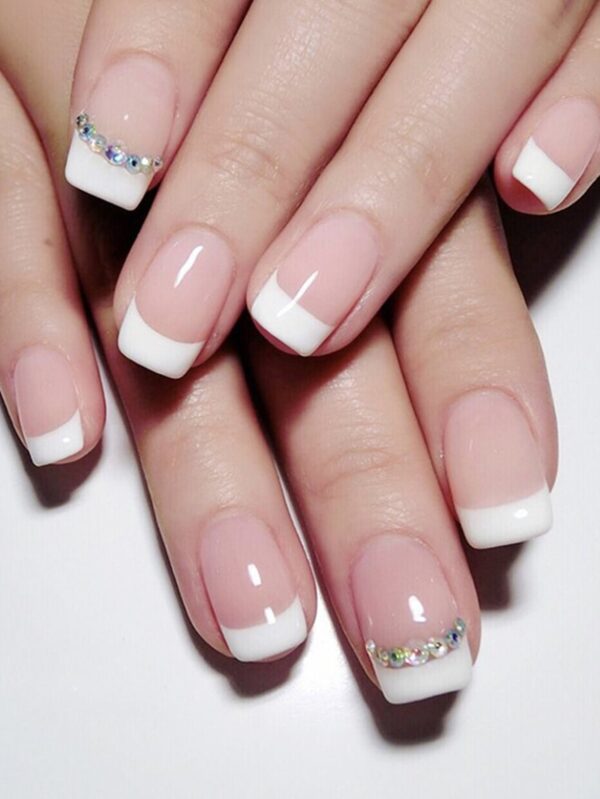 طقم أظافر لاصقة بتصميم أطراف فرنسية وحجر الراين – 12 زوج – Size: