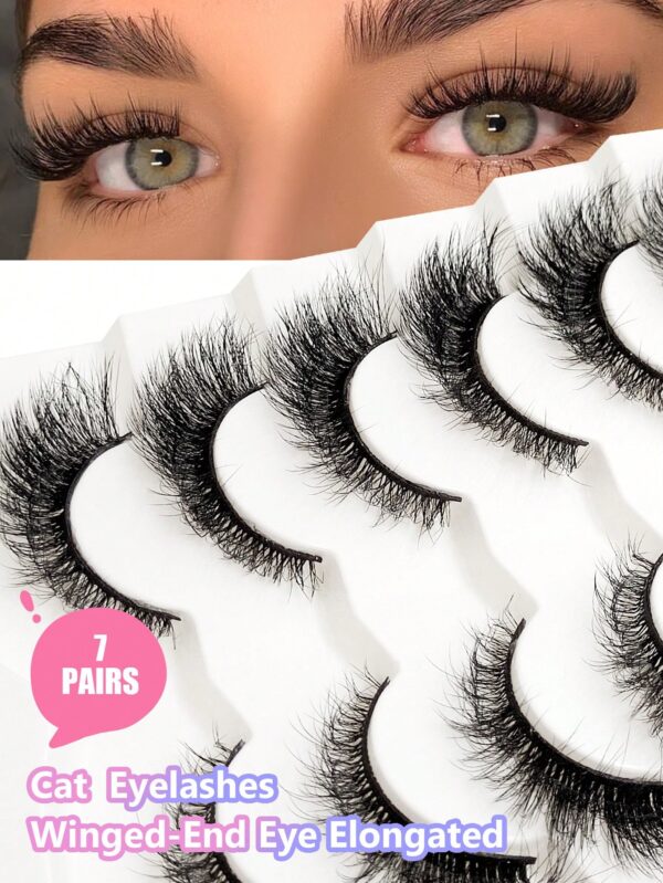 ظلال العيون المزيفة بأزواج 7 أزواج، رموش كات آي بمزيج من خيوط المنك التي تعطي مظهرا طبيعيا واقعيا للعين بصفة عامة، مع تموجة في الجناح الخارجي مع إطراف غير منتظمة وطويلة، وهي رموش مزيفة كثيفة وناعمة. – Size: