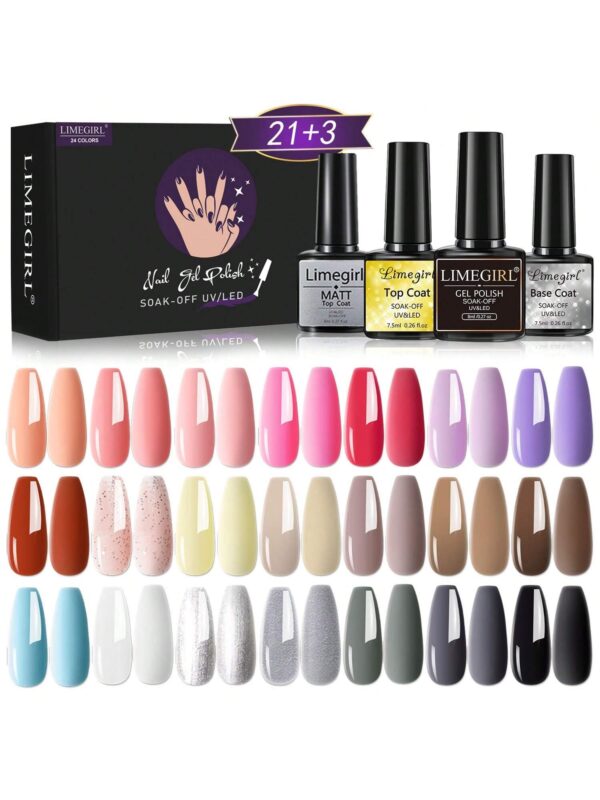 عدة طلاء أظافر لامع شبه دائم 24 قطعة، مجموعة طلاء أظافر جل 21 لونًا تحتوي على طلاء قاعدة وطبقة سطحية، طلاء أظافر جل زاهية الألوان، طلاء أظافر جيل لامع يزول بعد التنظيف بالمذيبات، احترافي لصالون الأظافر هدية للنساء – Size: