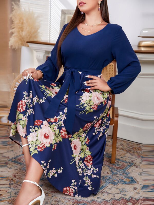 فستان بحزام وأكمام فانوس وطباعة زهور عشوائية مقاس كبير – Size: 5XL