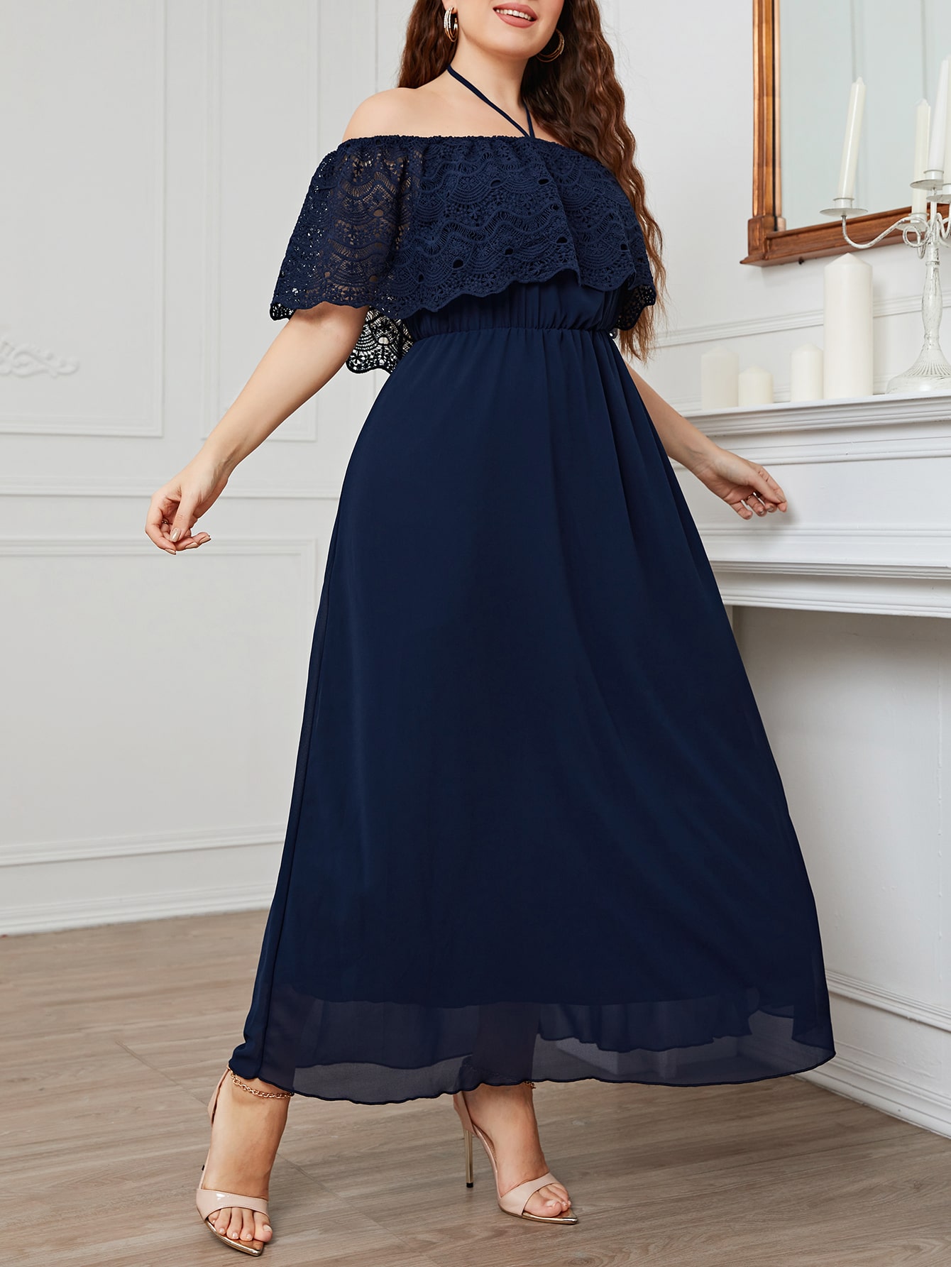 فستان دانتيل بثقوب متباين رسن عنق مقلم بكشكش شيفون مقاس كبير – Size: 2XL