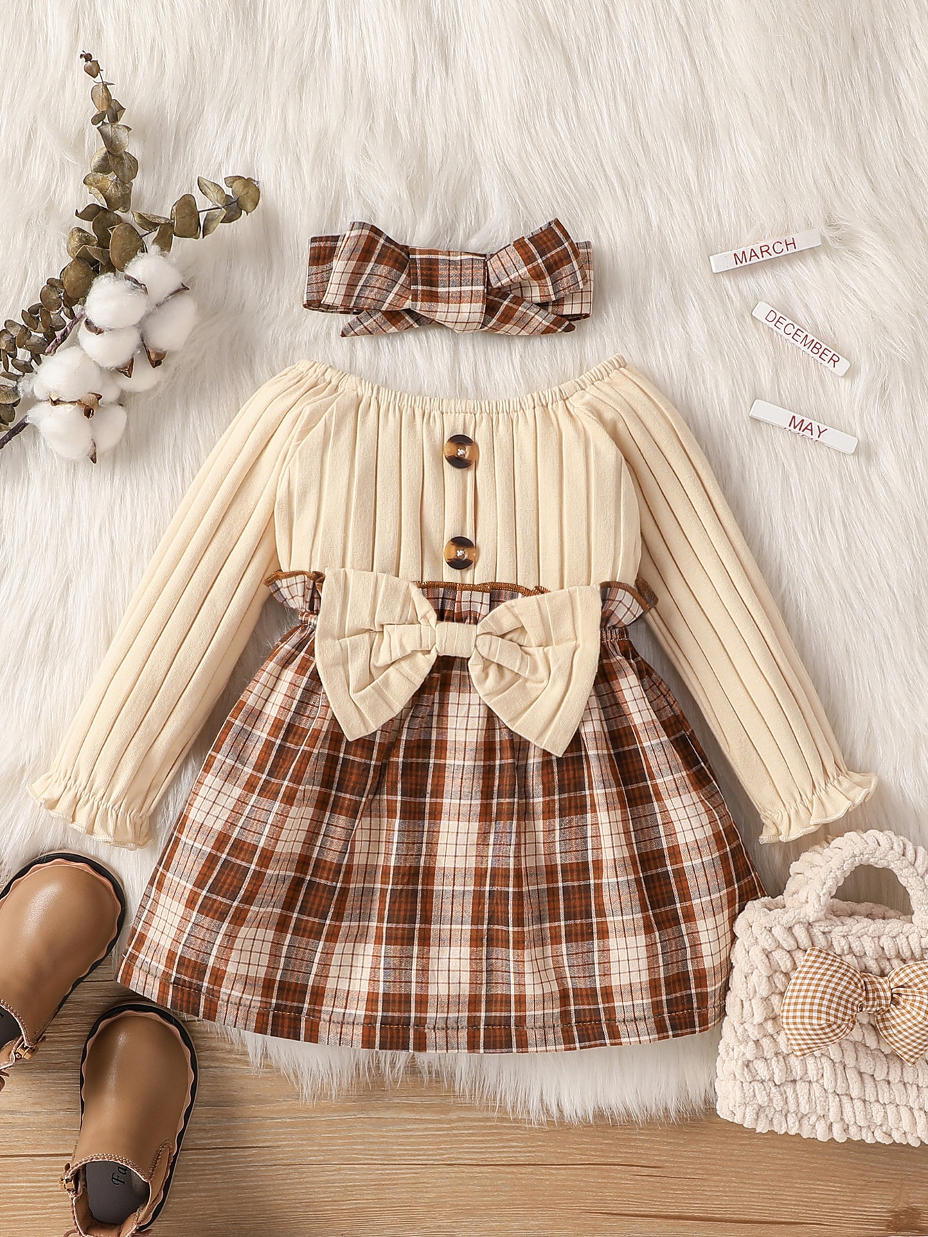 فستان طباعة مربع النقش فيونكات أمامية اكمام منتفضة مع عقال الرأس للاطفال – Size: 12-18M
