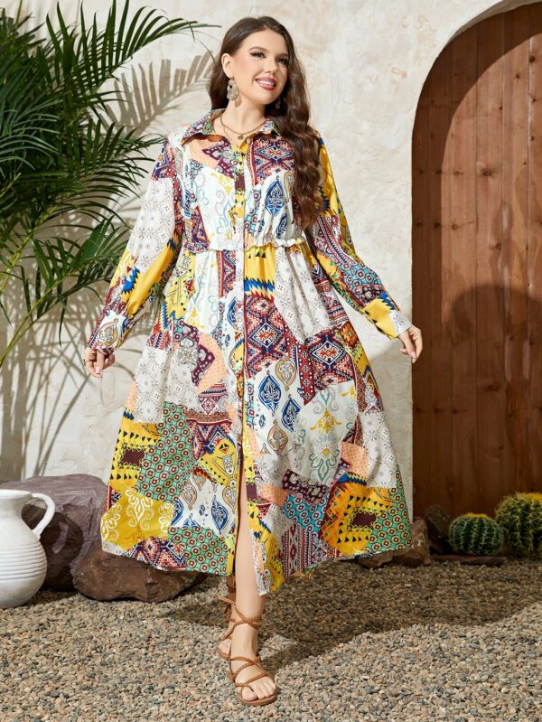 فستان قميص طباعة مختلط أزرار أمامية مقاس كبير – Size: 3XL