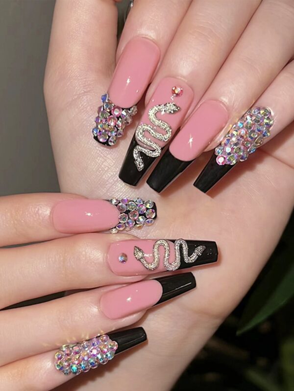 في الحال يرقي مظهرك مع 24 قطعة طويل نعش أسود فرنسي حجر الراين ثلاثي الأبعاد بديكور ثعبان أظافر اصطناعية ملف الأظافر 1قطعة & ورقة واحدة شريط – Size: