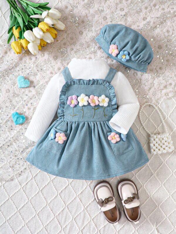 للبنات الاطفال وقوف الياقة تي شيرت & بطباعة أزهار كروشيه زخرفة مقلم بهدب فستان افرول & قبعة – Size: 12-18M