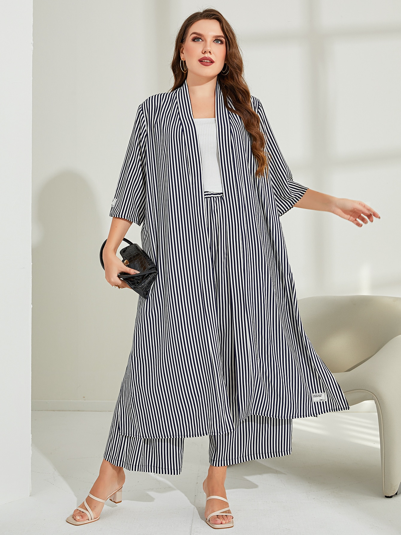 معطف مخطط عمودي مدرز بعبارة مفتوح امامي بحافة شق مع بنطلون مقاس كبير – Size: 3XL