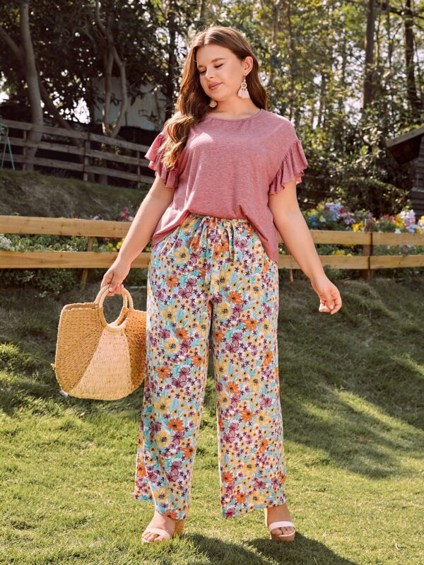 مقاس كبير لباس علوي مقلم بكشكش و بنطلون طباعة الأزهار – Size: 2XL