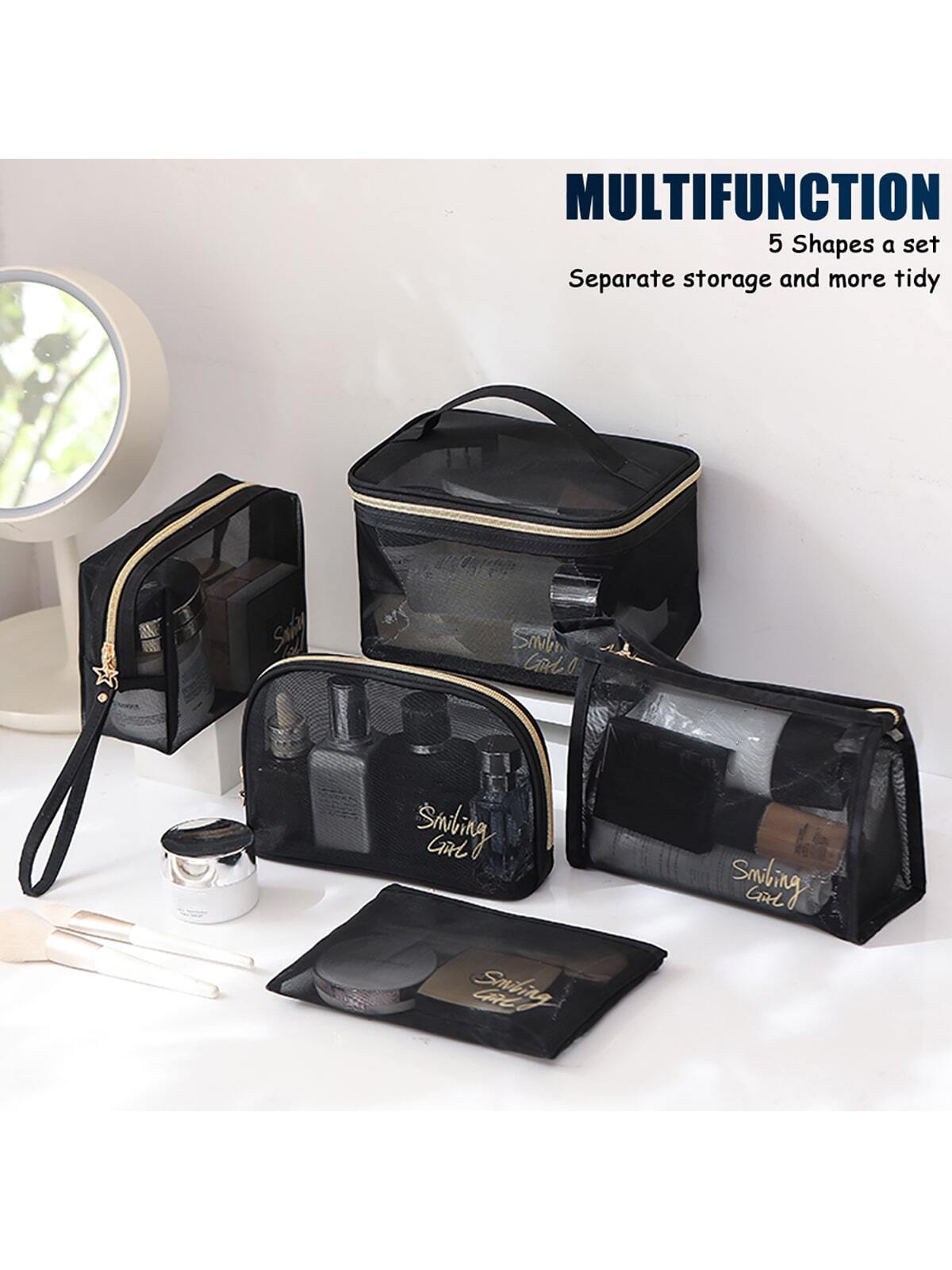 5قطعات/طقم الموضة شبكة حقيبة مستحضرات التجميل , أسود تنفس حقيبة تخزين , محفظة عملات معدنية , كيس الغسيل أسود جمعة – Size: