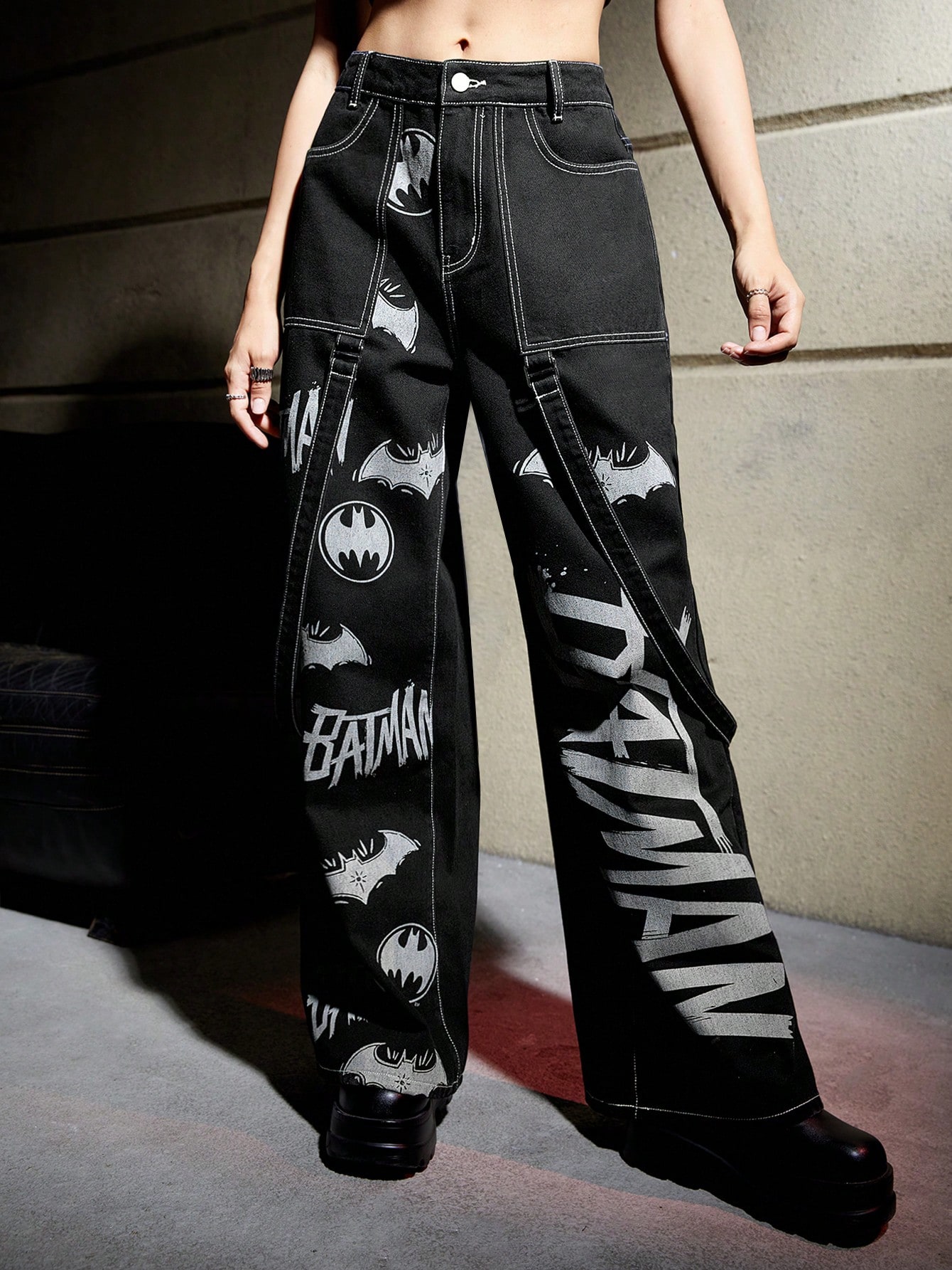 Batman X ROMWE بنطلون جينز بطباعة أحرف ساق عريضة – Size: M