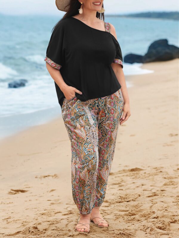 EMERY ROSE مقاس كبير ياقة غير متماثل مقلم متباين لباس علوي و طباعة بيزلي بنطلون – Size: 1XL