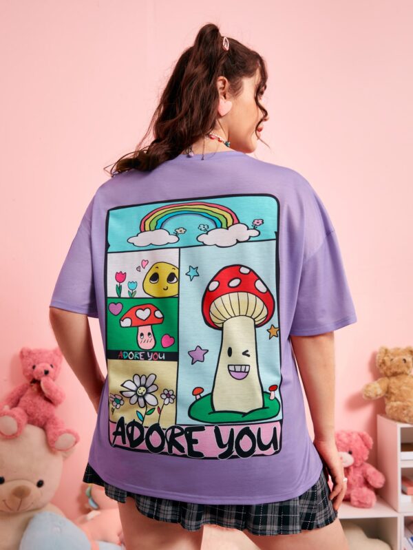 كمية ROMWE تي شيرت منخفض الاكتاف فطر و صور رسوم كارتون مقاس كبير - Size: 4XL