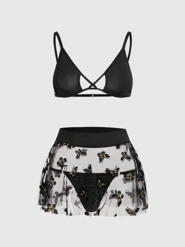 ROMWE Goth مجموعة ملابس داخلية جذابة بقماش شفاف مطرز بزهرة الفراشة – Size: M