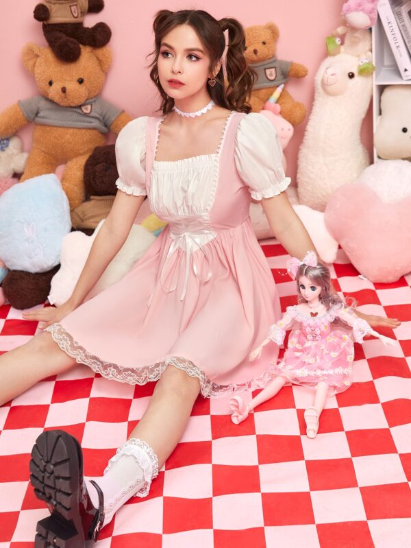 ROMWE Kawaii فستان رباط اكمام منتفخة رباط – Size: L