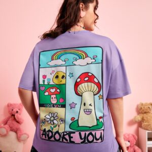 ROMWE تي شيرت منخفض الاكتاف فطر و صور رسوم كارتون مقاس كبير – Size: 4XL