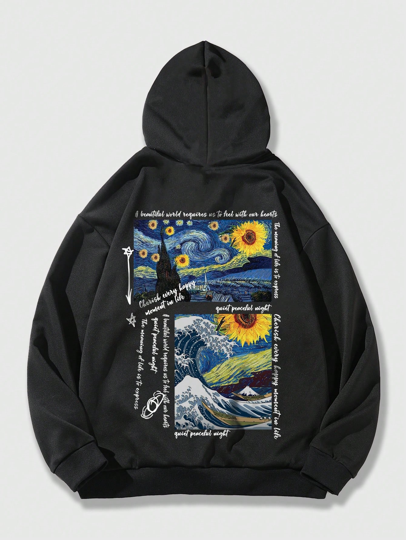 ROMWE Street Life هودي برباط يوجد عليه شعار وطبعة موجة للرجال – Size: M