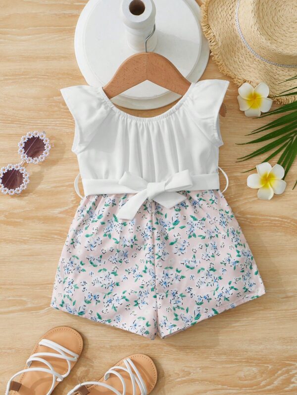 SHEIN رومبير بطباعة أزهار اقحوان مقلم بكشكش حزام للاطفال – Size: 12-18M