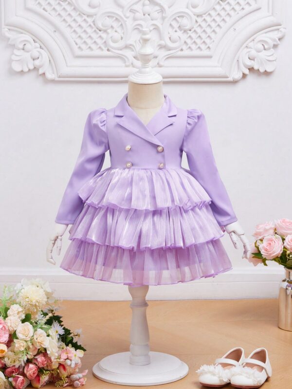 SHEIN فستان راقي بطبقات للأطفال الرضع بطية بدلة بياقة وأكمام طويلة بقماش التول المزخرف بالرباط – Size: 2-3Y