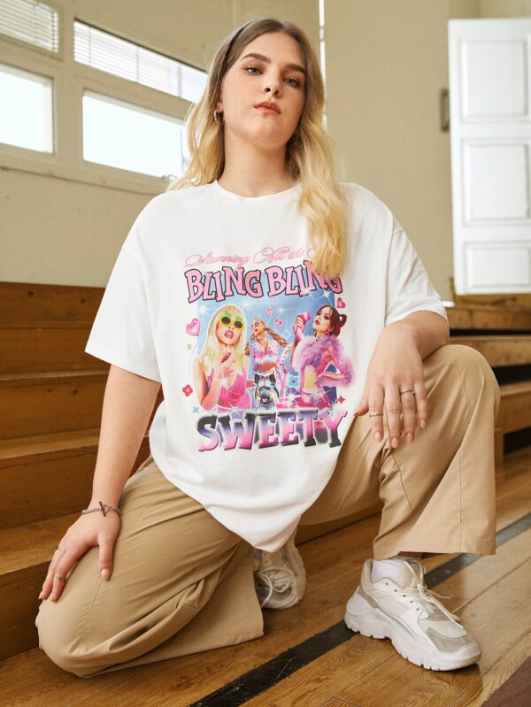 SHEIN EZwear تي شيرت منخفض الاكتاف بجرافيك شخصية وعبارة مقاس كبير – Size: 3XL