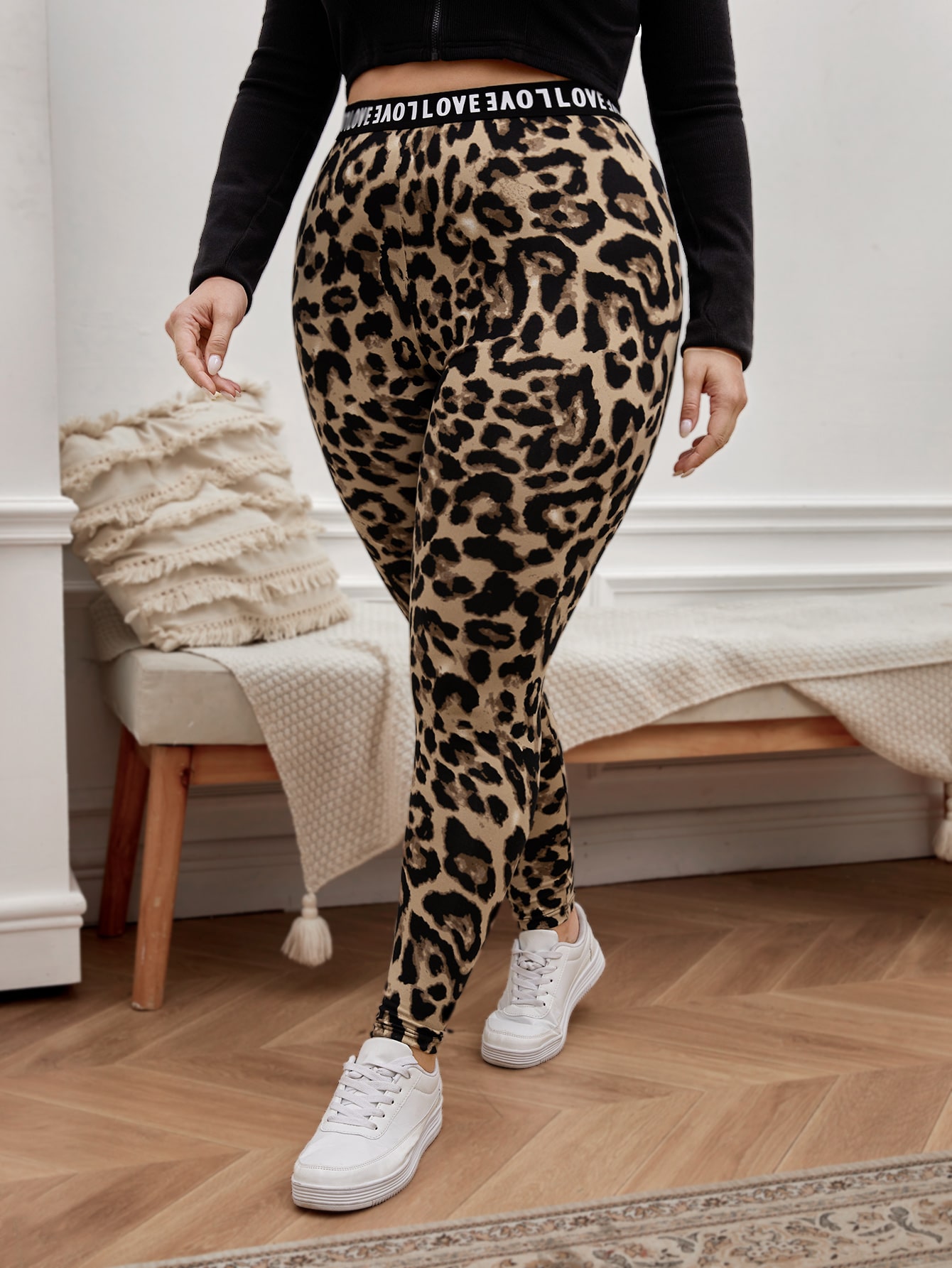 SHEIN LUNE طماق طباعة الفهد متباين شريط عبارة مقاس كبير – Size: 3XL