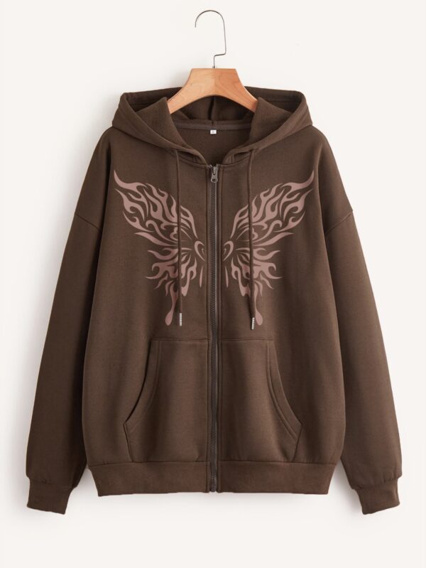 SHEIN LUNE هودي بطباعة الفراشة سستة منخفض الاكتاف رباط مبطن حراري مقاس كبير – Size: 4XL