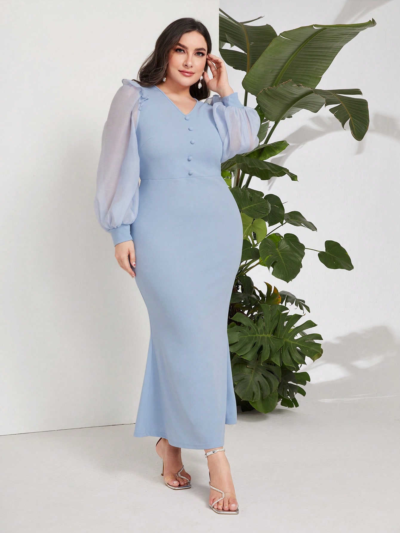 SHEIN Modely فستان شبكة متباينة أكمام فانوس حافة حورية البحر مقاس كبير – Size: 2XL