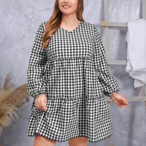 SHEIN مقاس كبير فستان سموك أكمام فانوس مقلم بهدب بطباعة مربعات غنغهام – Size: 2XL