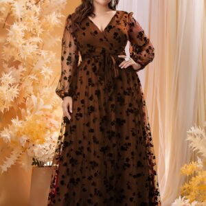 مقاس كبير فستان ماكسي متباين بطباعة أزهار شبكة حزام – Size: 3XL