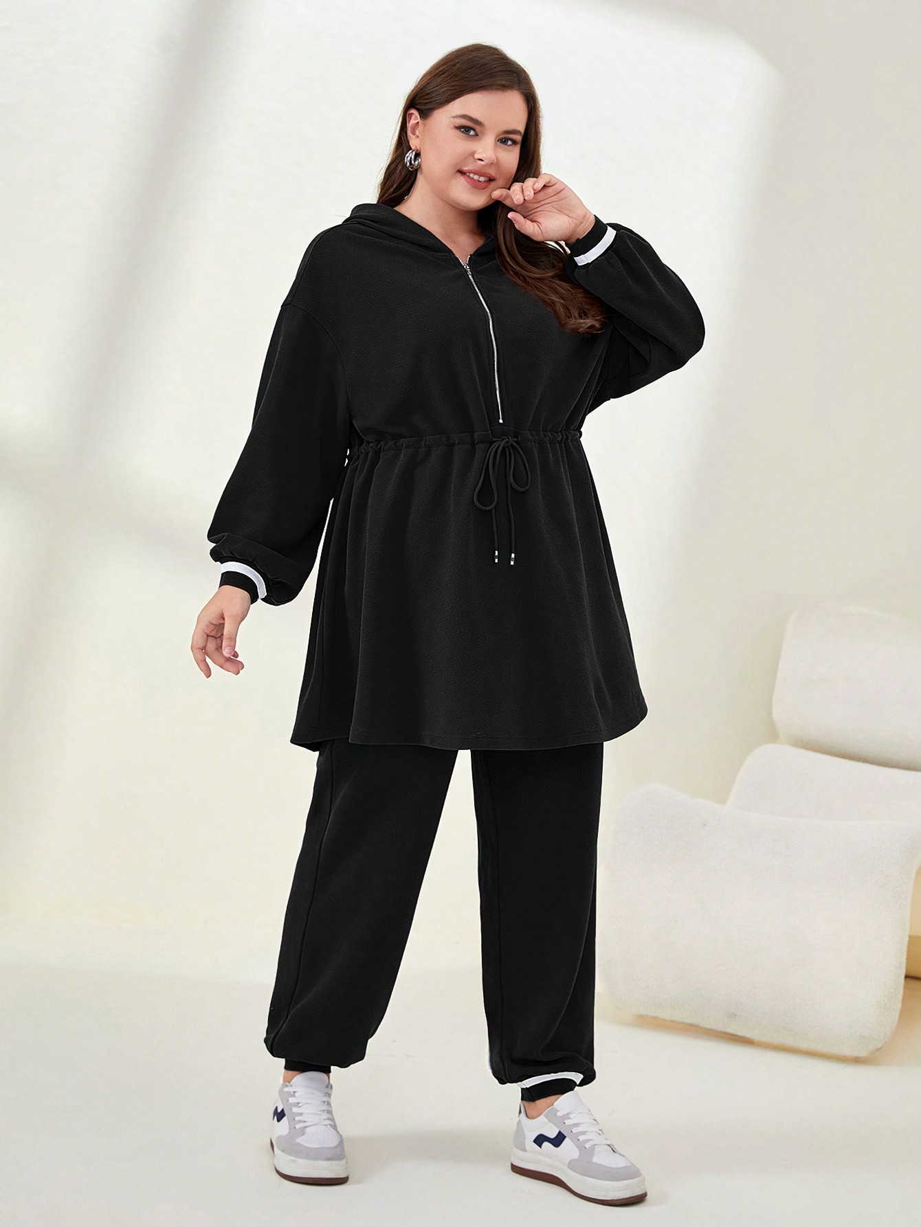 كمية SHEIN Mulvari هودي وبنطلون رياضي مقلم مخطط رباط خصر مقاس كبير - Size: 1XL