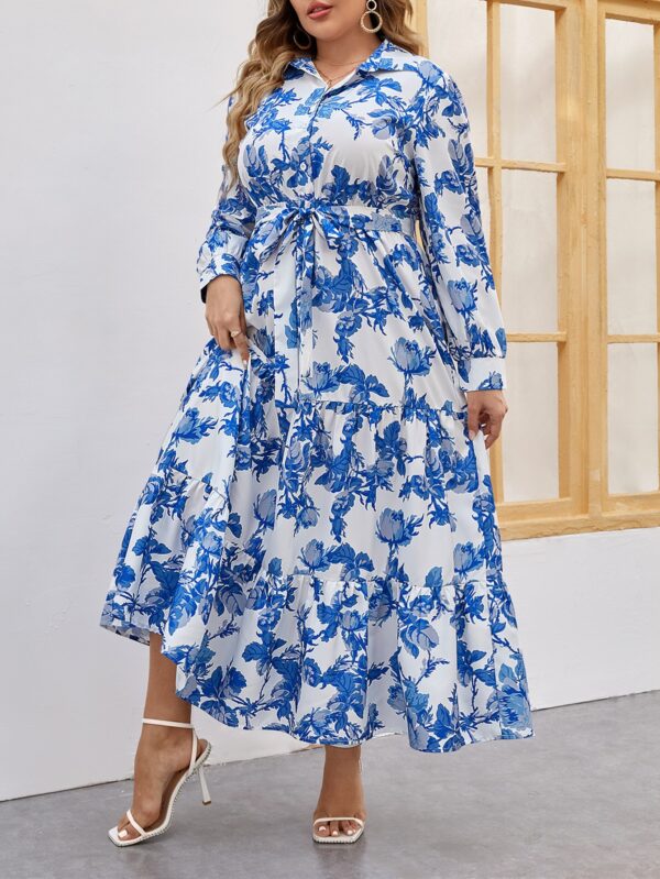 SHEIN VCAY فستان قميص طباعة الأزهار حافة مكشكشة حزام مقاس كبير – Size: 4XL
