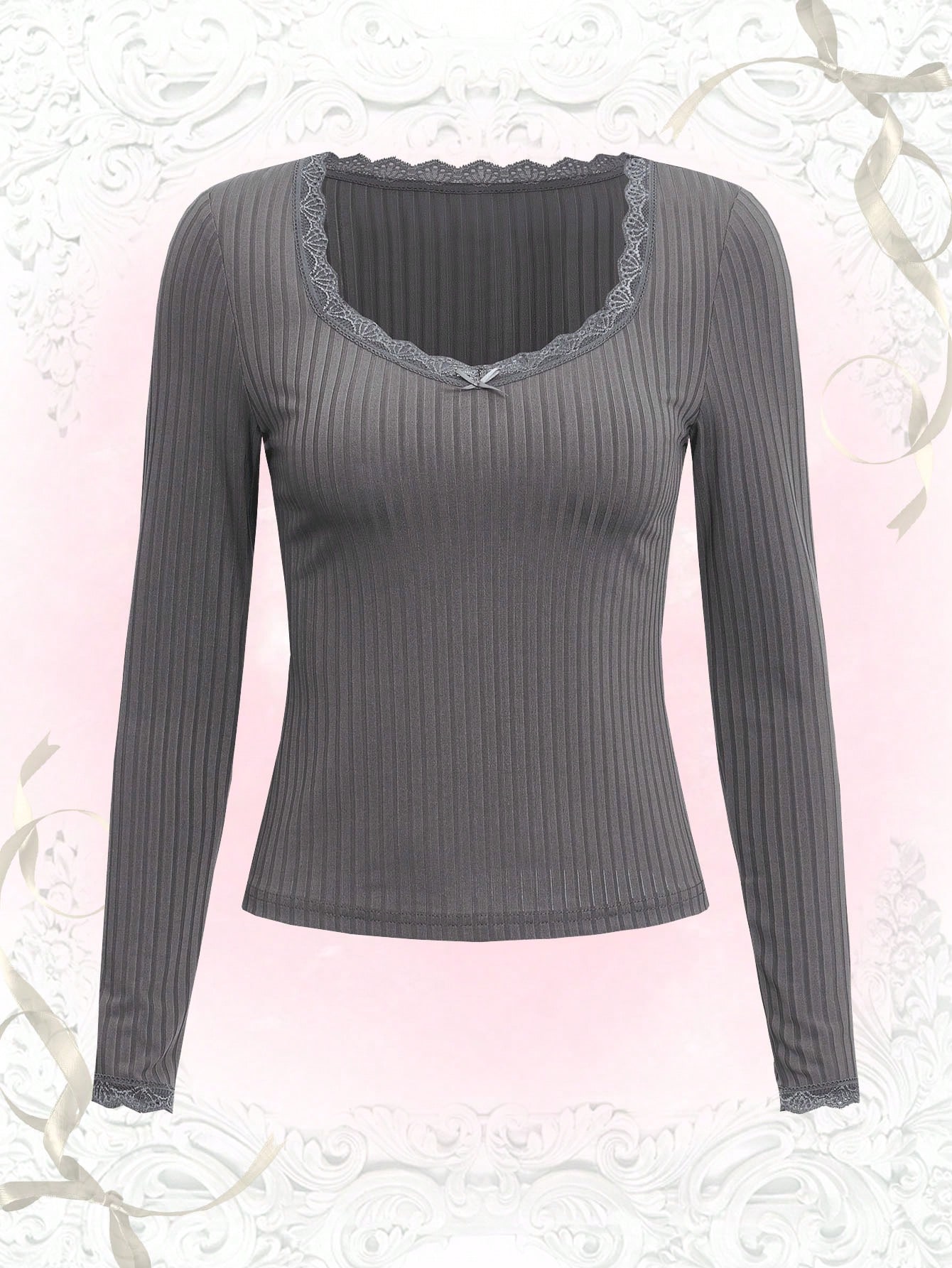 كمية Sweetness تي شيرت موحدة اللون دانتيل متباين اللون - Size: M